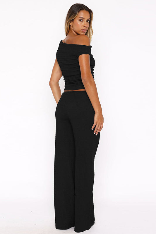 Solid Sloping-Shoulder Shirred Slim Top & Wide-Leg Trousers 2-Piece Co-ord Set