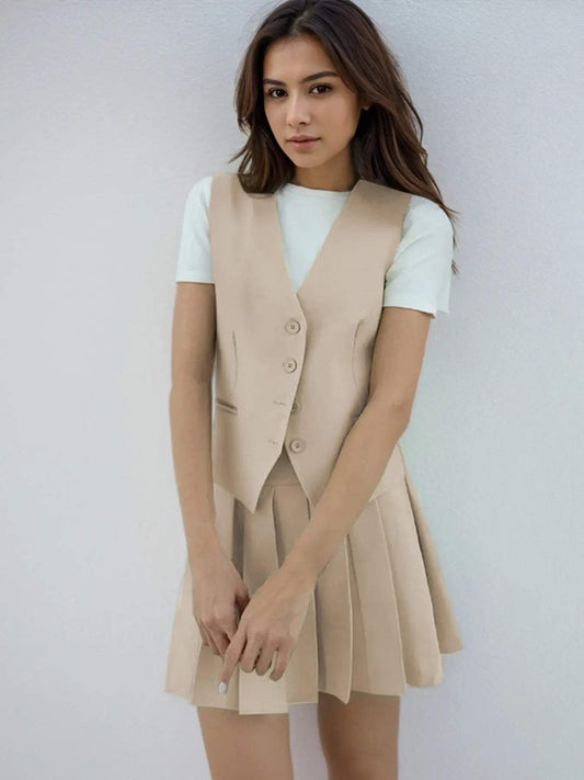 Summer Elegant V Neck Sleeveless Button Tank & Pleated Mini Skirt Co-ord