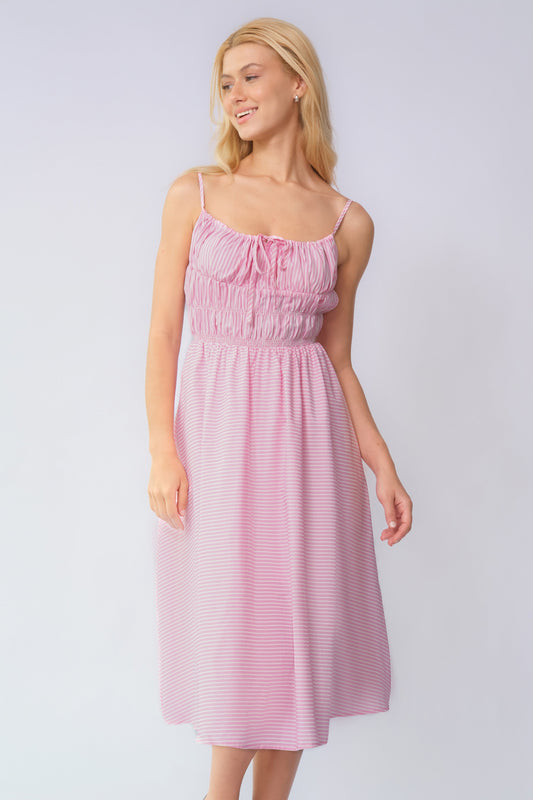 Casual Spaghetti Strap Front Tie Ruched Stripe Maxi Dress