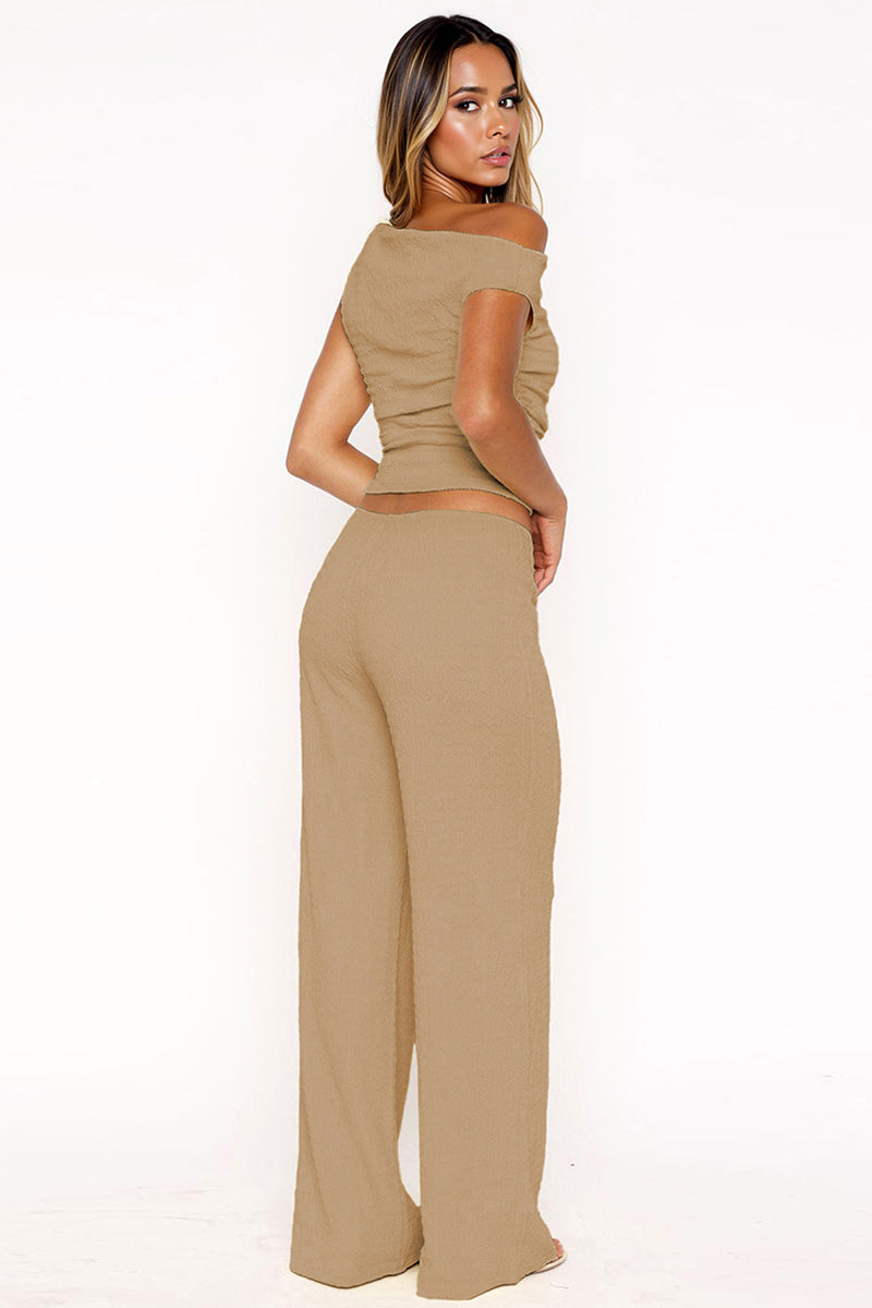 Classy Solid Color Collared Shell Button Loose Top & Drawstring Wide Leg Trousers Co-ord