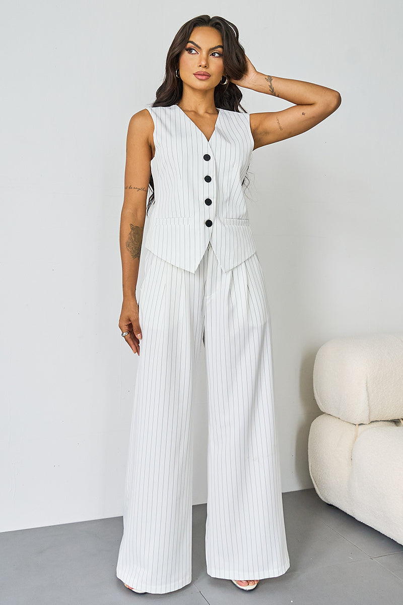 Classy Solid Color Collared Shell Button Loose Top & Drawstring Wide Leg Trousers Co-ord