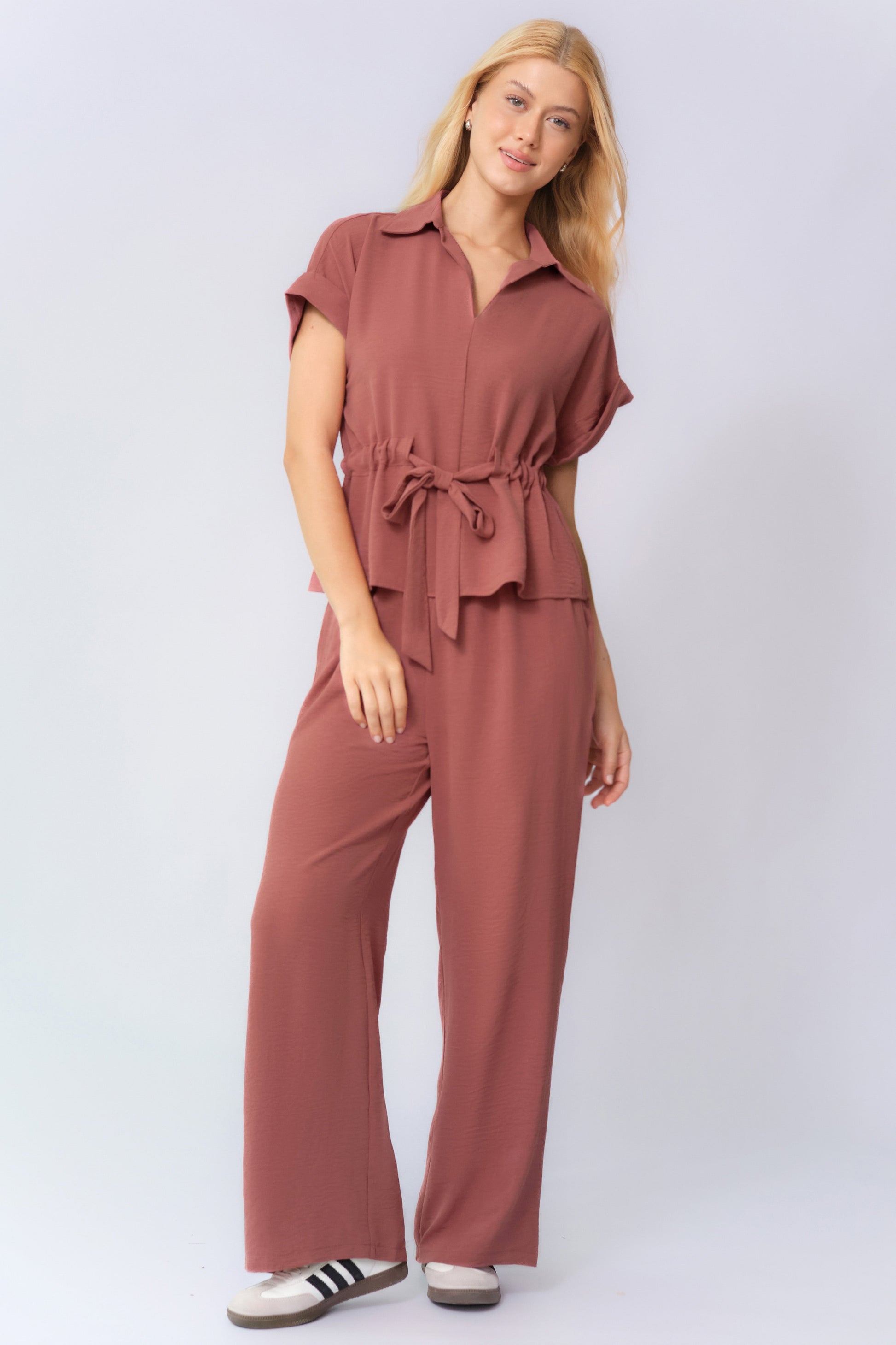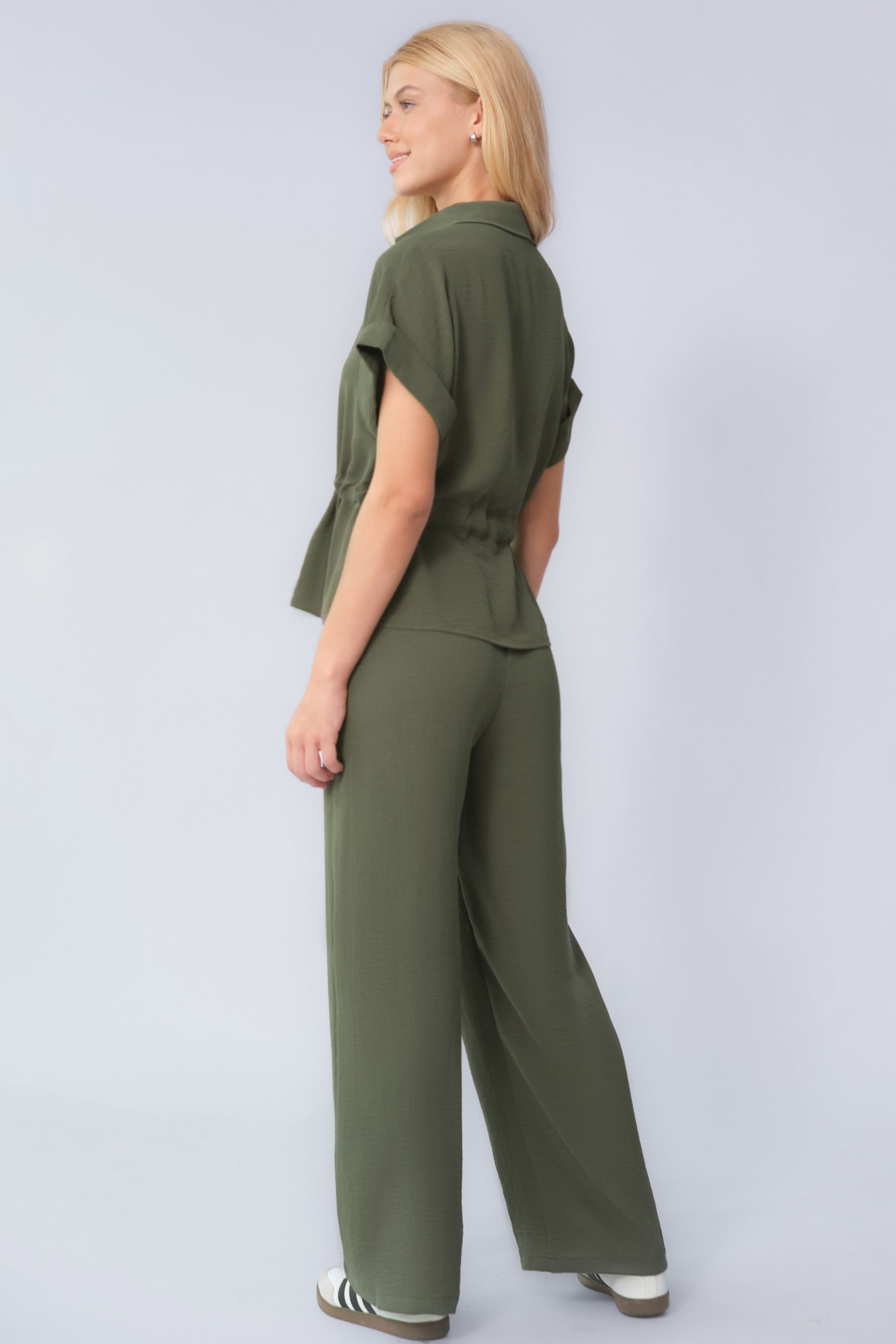 Versatile Collared Rolled-Up Short Sleeve Top & Wide Leg Trousers Co-ord